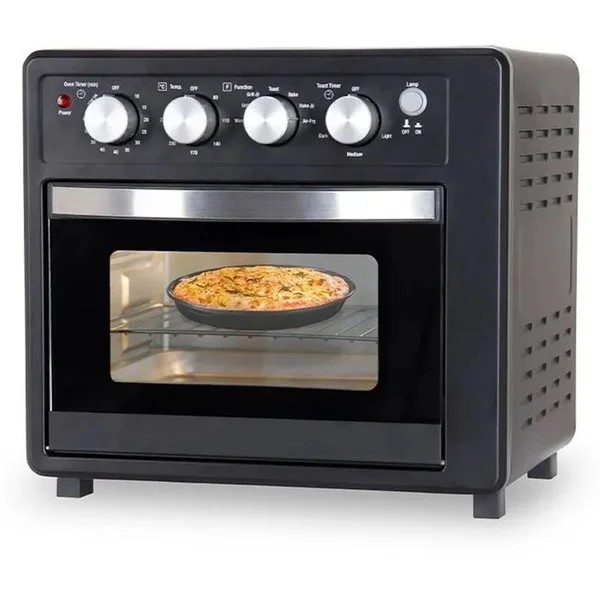 A 25 litre air fryer oven with digital controls, adjustable temperature, and multiple cooking functions, designed to air fry, bake, grill and prepare a variety of dishes with included accessories.