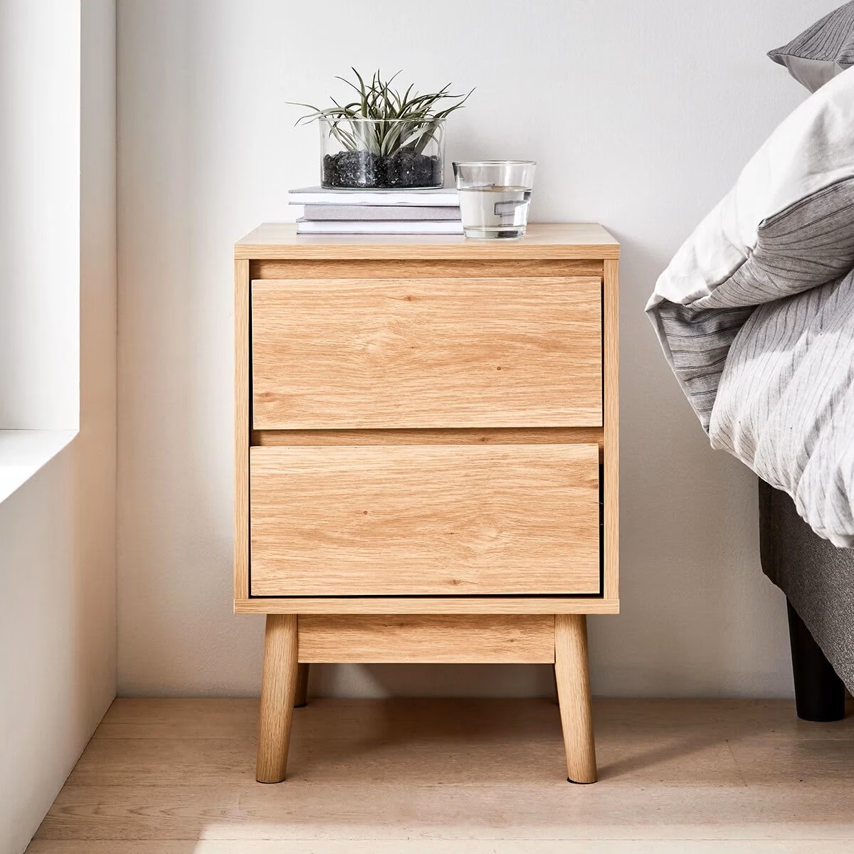 A sleek bedside table with a drawer and open shelf, providing stylish storage and a surface for bedside essentials.